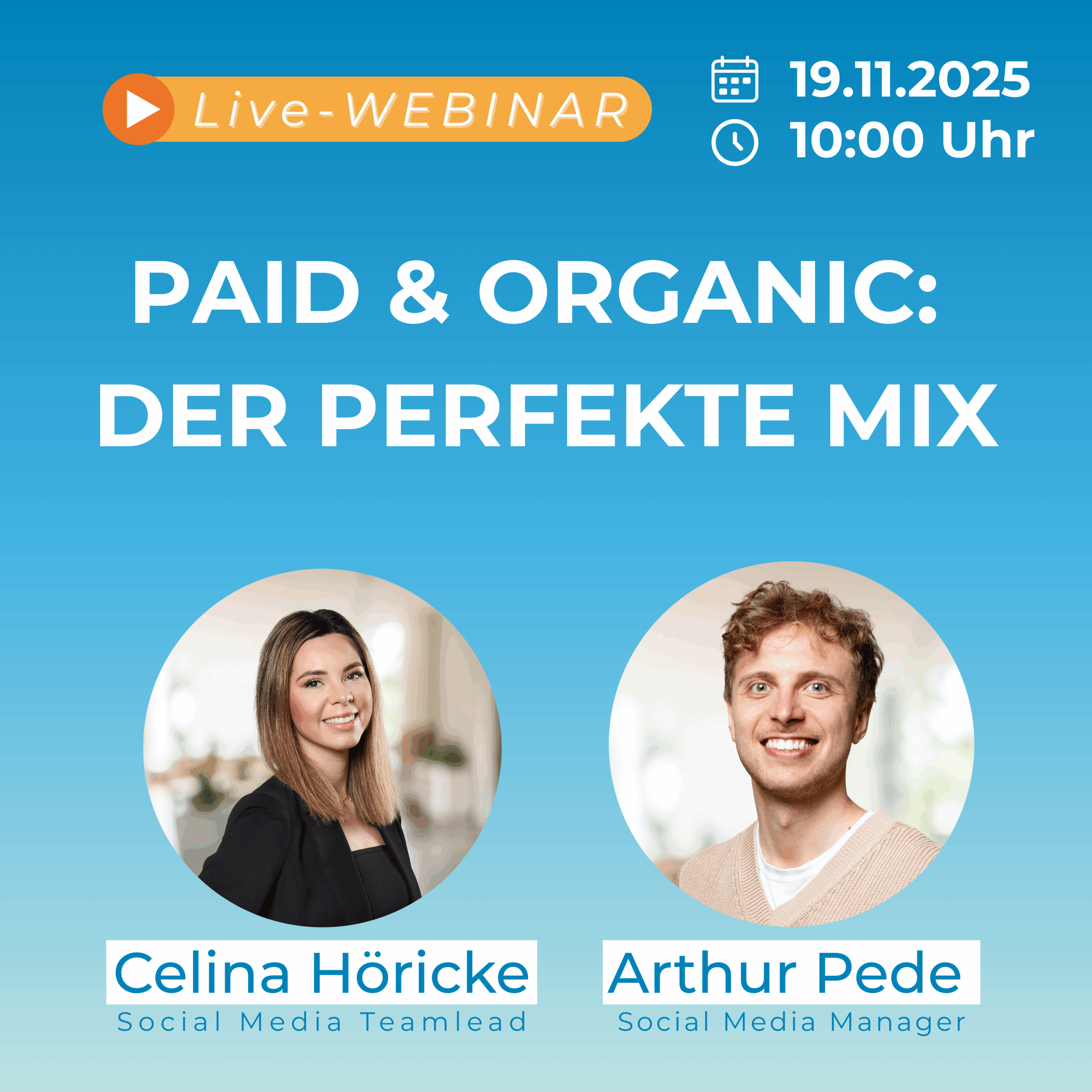 Viele Unternehmen investieren in Social Ads – doch das volle Potenzial entfaltet sich erst, wenn Paid und Organic zusammen gedacht werden. Mit der richtig gewählten Kombination erzielst du mehr Sichtbarkeit, Interaktion und langfristiges Wachstum. In unserem Webinar erfährst du, wie du bezahlt Reichweite clever mit authentischem Content kombinierst, Synergien zwischen Ads und organischen Posts nutzt und deine Social-Media-Aktivitäten effizient skalierst.