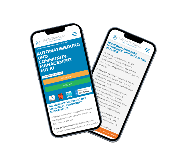 Bei Hanseranking nutzen wir die neuesten KI-Technologien, um dein Community-Management zu optimieren, ohne dabei die menschliche Note zu verlieren. Wir helfen dir dabei, die richtige Balance zwischen Automatisierung und persönlicher Betreuung zu finden, sodass deine Community sich wertgeschätzt fühlt und gleichzeitig dein Team entlastet wird.