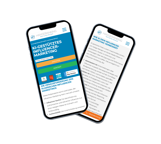 Bei Hanseranking setzen wir auf modernste KI-Technologien, um dein Influencer-Marketing gezielt zu optimieren. Wir kombinieren unser fundiertes Wissen über Influencer-Beziehungen mit der analytischen Stärke der KI. So finden wir nicht nur die passenden Influencer für deine Marke, sondern entwickeln auch eine durchdachte Strategie, die authentische Reichweite generiert und messbaren Erfolg liefert.